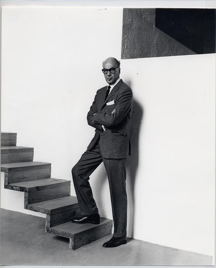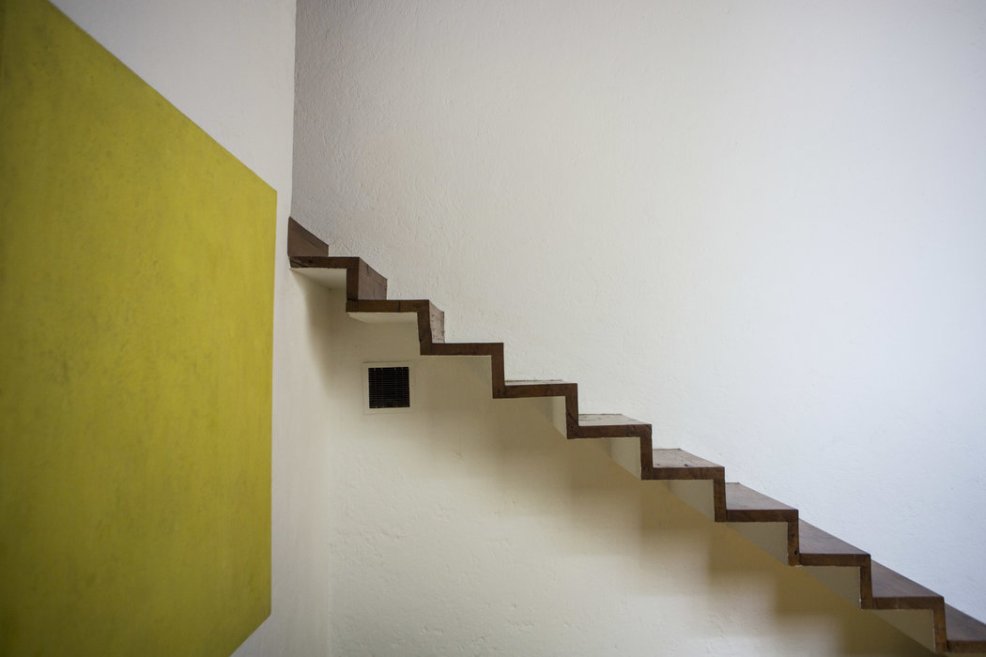 Estimulante y ligero plano de madera de sabino doblado para formar un elemento continuo en forma de trece peldaños y una puerta (en realidad piezas indiviudales empotradas en muro y voladas) desde la biblioteca al tapanco de la Casa Barragán (1948) de Luis Barragán.