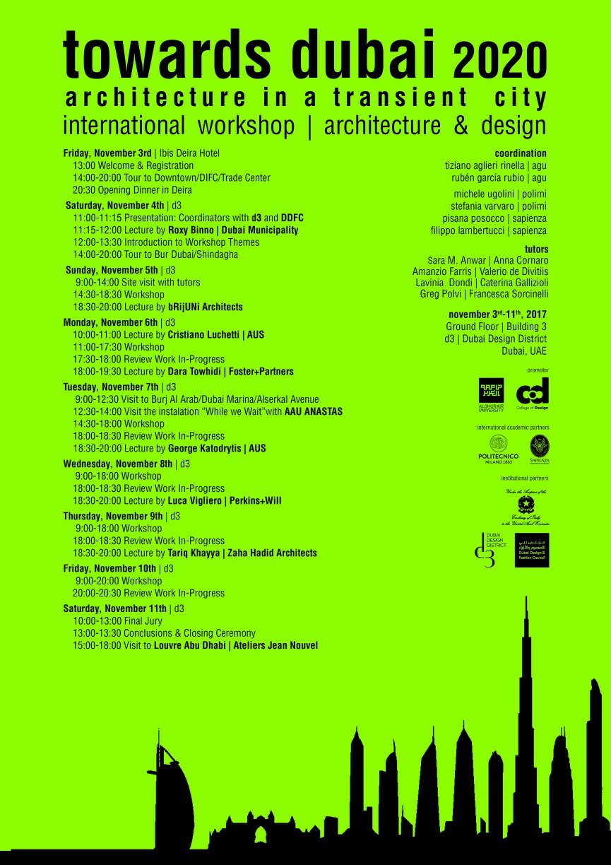 The Workshop is promoted by international universities led by the College of Design of Al Ghurair University in Dubai (UAE), Politecnico di Milano (Italy) and Sapienza University of Rome (Italy).