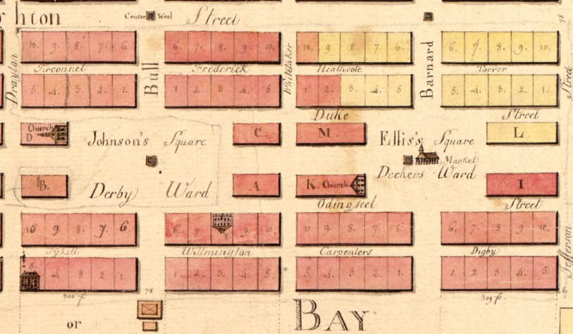 Detalle de dos unidades. «A plan of the city of Savannah : with a drawing of the part of the city burnt in the dreadful fires of the 26 November & 6 December, 1796». Marian S. Carson Collection (Library of Congress)